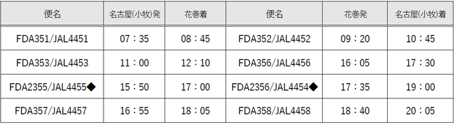※なお、JALとのコードシェアは実施いたしませんが、FDAでは以下の便も期間増便いたします。