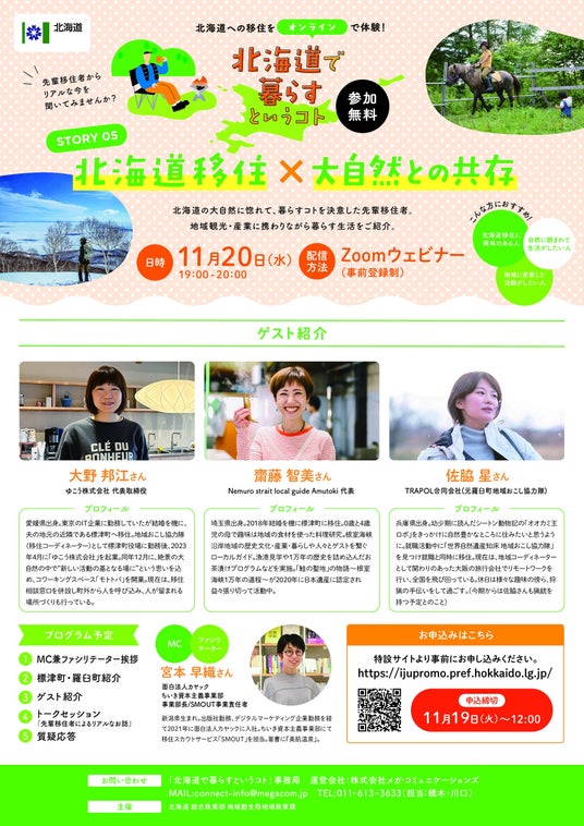 北海道への移住、北海道での仕事や生活に興味がある方に向けて、先輩移住者から仕事やプライベートの情報をお届けするオンラインイベントを開催しますので、お知らせします。