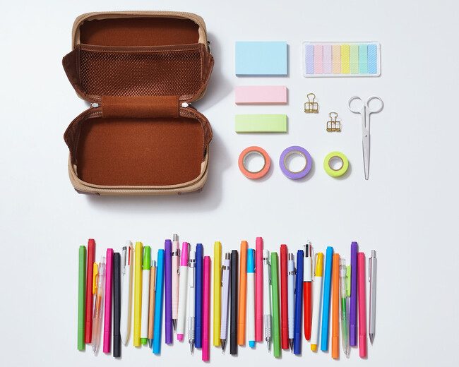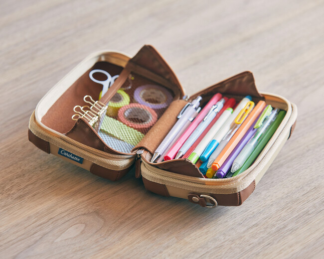 『カルシェット』ポーチタイプは、ばらつきがちな小物をまとめて収納できるキャリングポーチです。ペンが約35本入り、マスキングテープやはさみなども一緒に収納できます。丈夫な素材のためガジェットケースとしても使用でき、マウスやポケットWi-Fi、ケーブルなどの収納におすすめです。内側のサイドファスナーを開くとフラットになり、取り出しやすいトレイ形状で使用できます。