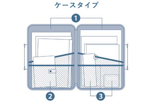 ケースタイプには3つのサイズのメッシュポケットが付いています。
