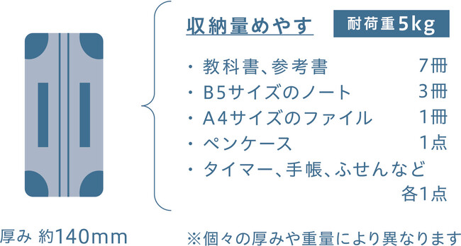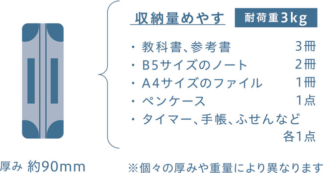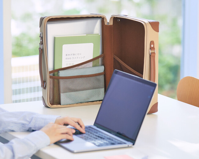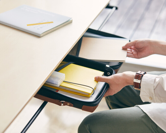 『カルシェット』ケースタイプは、教材やPC、タブレットなどの収納にぴったりなキャリングケースです。最大180°開き、机の棚に入れると引き出しのように使用できます。90°に開くと自立するので、カフェや図書館などの狭い場所で省スペースにお使いいただけます。教材をたっぷり収納できるワイドサイズ(耐荷重5kg)と、よりコンパクトに使えるスリムサイズ(耐荷重3kg)の2サイズ展開です。
