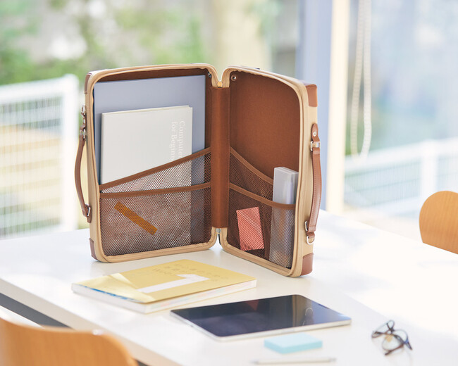 ケースタイプは180°開いて机の棚に入れることで、引き出しのように使用できます。90°に開くと自立が可能で、カフェや図書館などの狭い場所でも便利に使えます。ポーチタイプは内側のサイドファスナーを開くとトレイ形状で使用でき、スムーズに中身を取り出せます。