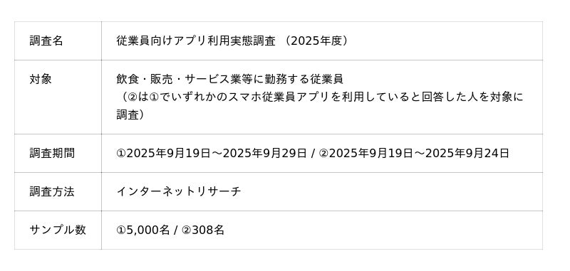店舗集客や販促を目的とした企業のOMO※1アプリの開発やマーケティングの支援、ソリューション導入において300以上の実績を持つ株式会社アイリッジ(本社:東京都港区、代表取締役社長:小田 健太郎、東京証券取引所グロース:3917、以下「アイリッジ」)は、飲食・小売(販売)・サービス業に勤務する5,000名を対象に「従業員向けアプリ利用実態調査」を実施し、調査結果をまとめましたのでお知らせします。