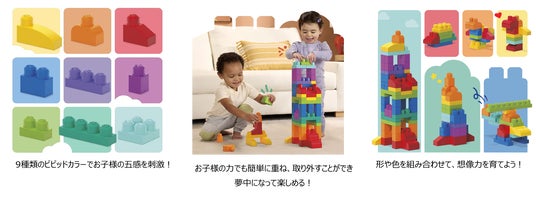・「1才からのメガブロック たっぷり80個ブロックパック」は、9色のカラフルな色使いと