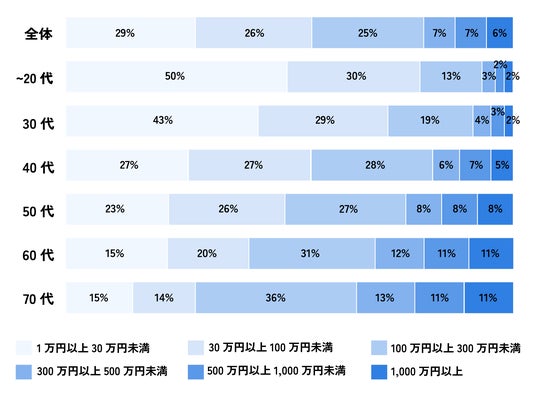 年代が上がるほど運用資産残高は増加傾向。若年層の投資意欲も顕在化全体の構成比率は、100万円以上45%、100万円未満55%。経験と資産規模の慎重に伴い、投資額は年代が上がるほど拡大する傾向が見られます。特に30代からは100万円超の投資が増加し、60~70代では500万円以上が20%を超えました。20代は100万円未満が80%ですが、100万円以上も20%と、投資意欲の高さがうかがえます。