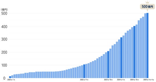 2025 年 4 月、累計ファンド申込額が 500 億円を突破。オルタナバンクの成長は止まらない!ファンド申込額と案件数は年々伸長。累計申込額は 2022年11月に100億円、2023年9月に200億円、2024年4月に300億円、同年10月に400億円、2025年4月4日に500億円を突破しました。2023年1月に「オルタナバンク」へリブランディングしたのを機に成長が加速し、2025年4月時点でも増加傾向が続いているため、今後も拡大が見込まれます。