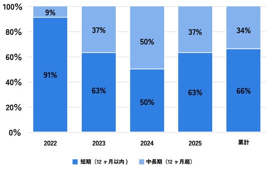 さまざまな投資プランに対応。運用期間の多様化を実現短期(12ヶ月以内)のファンドが91%だった2022年からラインナップを拡充し、2024年には短期50%・中長期(12ヶ月超)50%と均衡。累計比率も短期66%、中長期34%へシフトしました。中長期ファンドの組成を強化し、ライフステージとリスク許容度に合わせた資産形成を支援する体制をさらに整えてまいります