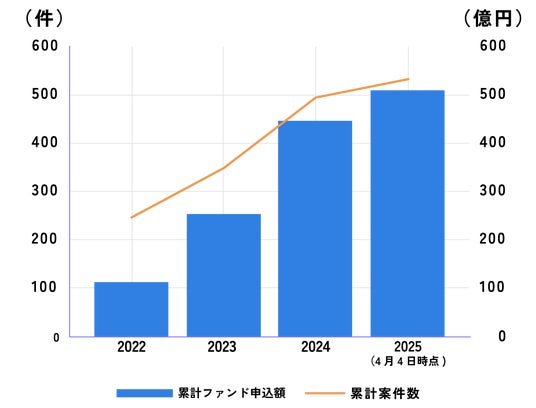 ※2025 年 4 月 4 日までに運用を開始したファンドの実績です。「累計ファンド申込額」及び「累計案件数」には、 各年とも、それ以前の実績が含まれます。SAMURAI CROWD(サービス終了)、SAMURAI FUND(現オルタナバンク) のファンドを含みます。