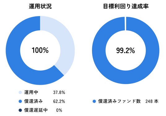 ※2022年1月1日から2025年3月31日までに運用を開始し、かつ償還した貸付型クラウドファンディングの実績です。SAMURAI FUND(現オルタナバンク)のファンドを含みます。なお、小数点以下第2位で四捨五入しております。※当該実績は過去の貸付型クラウドファンディングにおける実績であり、将来の運用成果を保証するものではありません。※上記運用状況は、貸付型クラウドファンディングの状況であり、当社グループ会社の貸付事業の運用状況とは異なります。