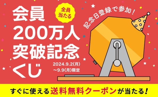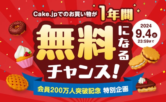 Cake.jpは、2024年8月に会員200万人を突破いたしました。会員200万人突破を記念して、支えていただいたお客様への日頃の感謝をお伝えるべく、人気スイーツ50商品以上が最大80%オフで購入いただけるセール企画や、Cake.jpでのお買い物が1年間無料になるチャンス「1年間無料キャンペーン」や最大10,000ポイントが当たるチャンス「ケーキジェーピージャンボ」など、お買い物が楽しくなる様々な企画でお客様に還元いたします。