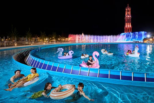その後ゲストは街並みや噴水をバックに写真を撮ったり、流れるプールでゆったりするなどして時間を過ごし、子供たちは浮き輪を使って泳いだり水をかけ合ったりと、きらきらした笑顔で遊ぶ様子が見られました。