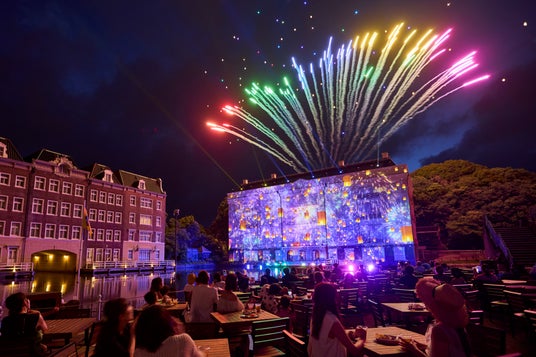 日が暮れてヨーロッパの街並みに淡いライトが灯ると、ドムトールンの麓にある運河テラスバル付近には、お酒や食事を楽しむゲストが集まり始めました。そして、20時を迎えると、ショーキャストの声で会場の雰囲気が一変。まるでミュージカルの世界に入り込んだかのように引き込まれる新たな「スペクタクルランタンナイトショー」が初お披露目しました。