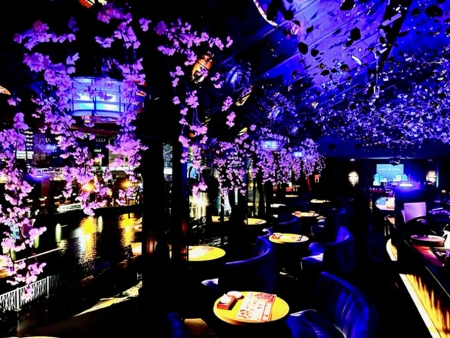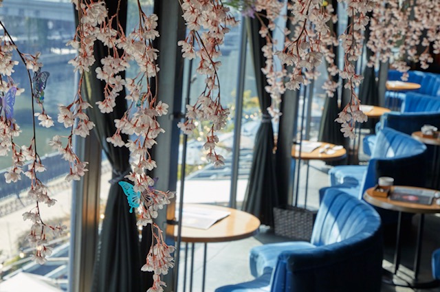 全席リバ―ビューの客船をイメージした店内でお昼は桜を見ながら苺のアフタヌーンティーを楽しめ、夜は青くライトアップされた夜桜を楽しみながら、春の食材を使用した点心など春限定の商品を販売致します。