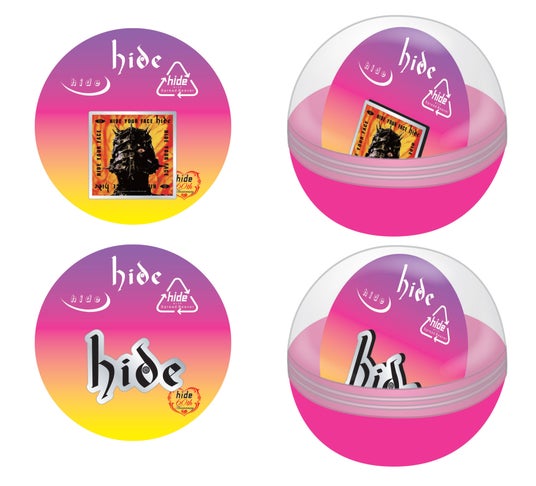 カプセルトイは、前回販売時と同様に「hide」の厳選したアルバム/シングル・ジャケットやロゴをデザインしたピンバッジ(ピンズ)<hide CDジャケット&ロゴコレクション>と、hideが使用したギターをモチーフにしたピンバッジ(ピンズ)<hide Guitar Collection>が専用台紙と共にカプセル内に収納されており、コレクションにも最適です。