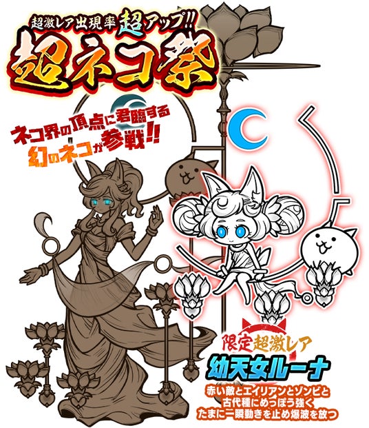 超激レア出現率が超アップするレアガチャ「超ネコ祭」に、新たな限定キャラクター「幼天女ルーナ」が参戦します。