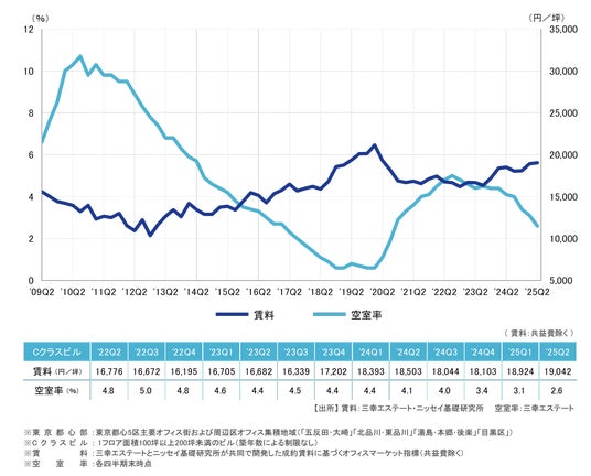 2025年第2四半期のCクラスビル賃料は前期比プラス118円/坪の19,042円/坪(共益費除く)となり、2020年第2四半期以来の19,000円/坪台を回復した。前期比で3期連続の上昇となり、緩やかな上昇傾向が続いている。
