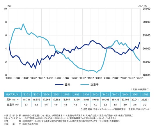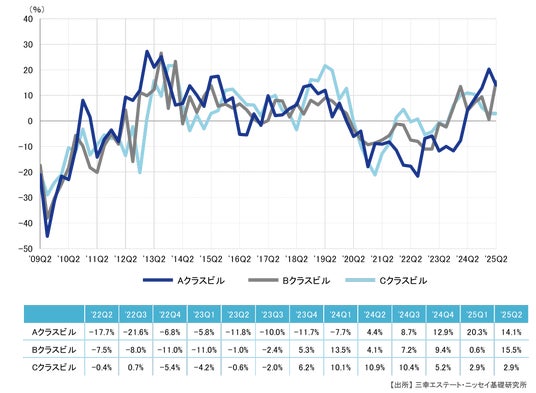 2024年第2四半期との比較による対前年変動率は、Aクラスビルがプラス14.1%、Bクラスビルがプラス15.5%、Cクラスビルがプラス2.9%だった。Aクラスビルは5期連続、BクラスビルおよびCクラスビルは7期連続のプラスとなっている。Cクラスビルは対前年変動率でプラスが続くものの、変動幅は低水準で推移している。