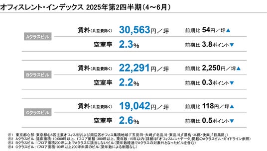 東京都心部 A・B・Cクラスビルの成約ベース賃料、空室率を発表