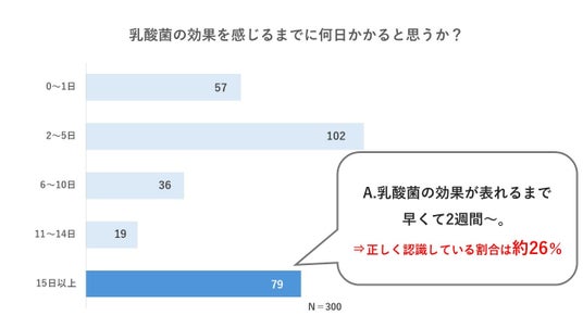 しかし、調査では「乳酸菌の効果が表れるまでにどれくらいの日数がかかると思うか?」という問いに対して約54%が 「0~5日」と回答しており、早い段階で効果を感じることができるものだと誤って認識している人も多いようです。これに対して杉山氏は、「ヨーグルトや乳酸飲料を食事に1度でも取り入れたら、それで満足してしまうという方も多いのではないでしょうか。しかしながら乳酸菌には即効性はなく、継続して摂取することが効果実感に繋がるため、無理のない範囲で毎日の生活に取り入れるとよいでしょう」とアドバイスしました。