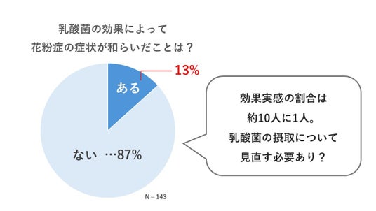 しかし、実態調査においては花粉症の症状があると回答した143名のうち、実際に「乳酸菌で花粉症の症状が和らいだ経験がある」のは約13%と、乳酸菌の効果を適切に感じることができている人はごく少数であることが分かりました。この結果に対して、杉山氏は「症状緩和の実感が感じられない場合は、正しい乳酸菌の摂り方が出来ていないのかもしれません」と指摘しました。