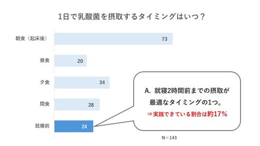 続いて、乳酸菌の摂取タイミングについて調査しました。乳酸菌を意識的に摂取していると回答した179名に「1日の中でどのタイミングで乳酸菌を摂取しているか?」と問うと、約4割が朝食(起床後)のタイミングで摂取していることが分かりました。この結果を踏まえ杉山氏は、乳酸菌の最適な摂取タイミングの1つとして「就 寝の2時間前」を挙げ、以下のようにコメントしました。