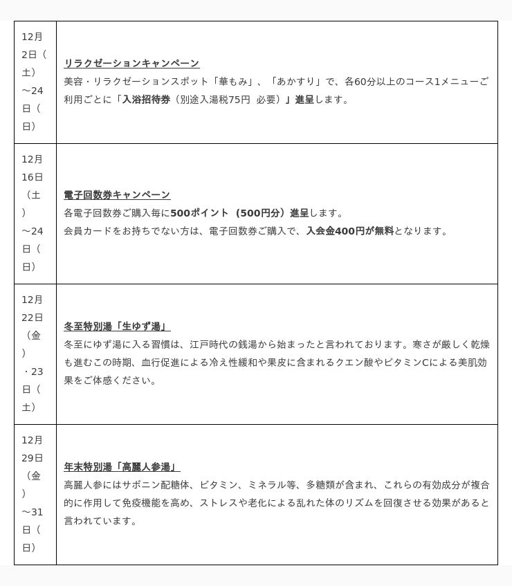 グンゼ株式会社の連結子会社であるグンゼ開発株式会社が運営する商業施設グンゼタウンセンターつかしんにある天然温泉「湯の華廊」は、日ごろのご愛顧に感謝し、「今年の疲れは今年のうちにリフレッシュキャンペーン」を12月2日(土)から31日(日)まで開催いたします。