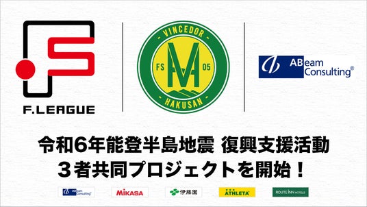 男女Fリーグを統括する、一般社団法人日本フットサルトップリーグ(所在地:東京都文京区後楽1丁目4−18 理事長:松井 大輔)は、令和6年能登半島地震復興支援活動の一環として、Fリーグディビジョン2に参加するヴィンセドール白山(本拠地:石川県白山市 責任法人:一般社団法人FSVスポーツアカデミー)およびFリーグ2024-2025オフィシャルスポンサー・アビームコンサルティング株式会社(本社:東京都中央区、代表取締役社長:山田 貴博)と共に、3者をコアメンバーとする復興支援活動を開始いたします。