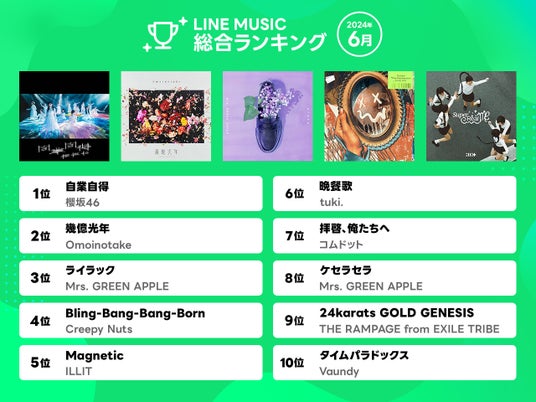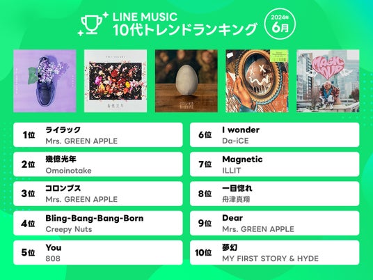 LINE MUSIC株式会社は、当社が運営する音楽ストリーミングサービス「LINE MUSIC」(iPhone・Android対応)の2024年6月の月間ランキングを発表、人気楽曲100曲を集めたプレイリストを公開します。さらに、「LINE MUSIC」独自のロジックで10代が今最も注目している楽曲を10代トレンドランキングとして発表します。
