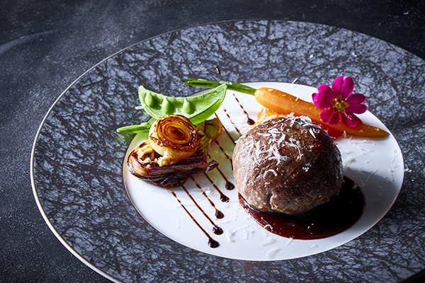 マイルドな味わいの鹿ロース肉の中には、生ハムで巻いたモッツアレラチーズが隠れております。「ボンベッテ」とはイタリア語で“肉爆弾”の意味。溢れ出るモッツアレラチーズが食欲をそそります。