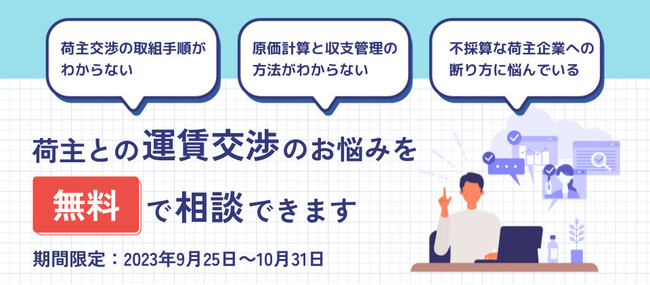 船井総研ロジ株式会社(東京本社:東京都千代田区、代表:菅重宏、以下「船井総研ロジ」)は、「運賃交渉の取り組み手順がわからない」「原価計算と収支管理の方法がわからない」という企業を対象にした、荷主交渉に関する「無料個別相談会」を2023年10月31日まで開催しています。