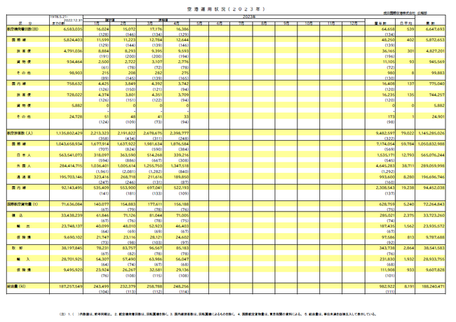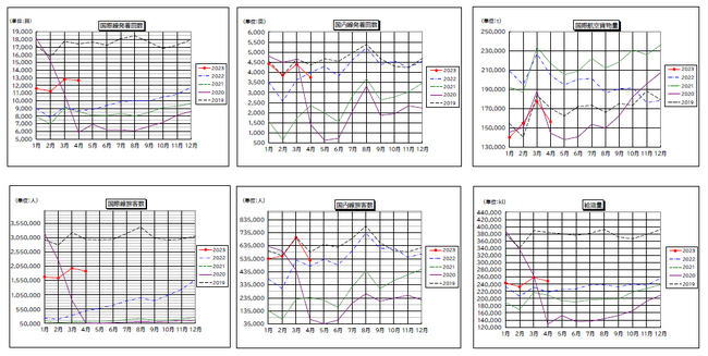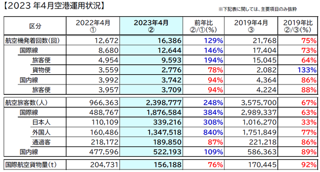 発着回数は9,593回 (前年同月比194%、19年同月比64%)と引き続きの回復傾向で、1万回も視野に入りつつあります。
