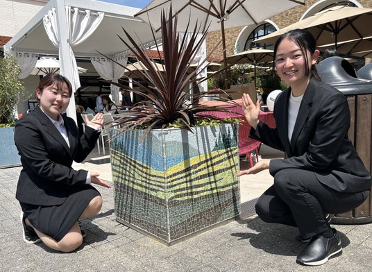 国立大学法人 佐賀大学(本部所在地:佐賀県佐賀市、以下「佐賀大学」)、株式会社船場(所在地:東京都港区、以下「船場」)および鳥栖プレミアム・アウトレット(所在地:佐賀県鳥栖市、運営:三菱地所・サイモン株式会社)は、産学連携プロジェクトとして、佐賀大学 芸術地域デザイン学部の学生12名とタイルアートプランター16点を共同制作し、アウトレット場内へ設置しました。また今月4月19日(土)にはプロジェクトの完成お披露目の場として、学生達による見学会が行われました。