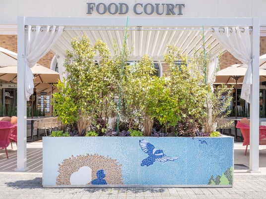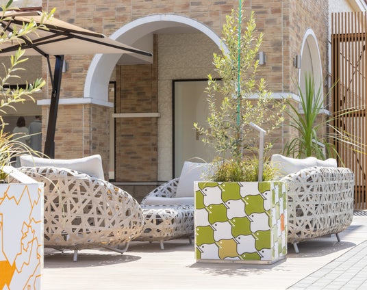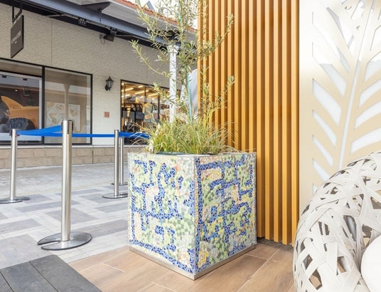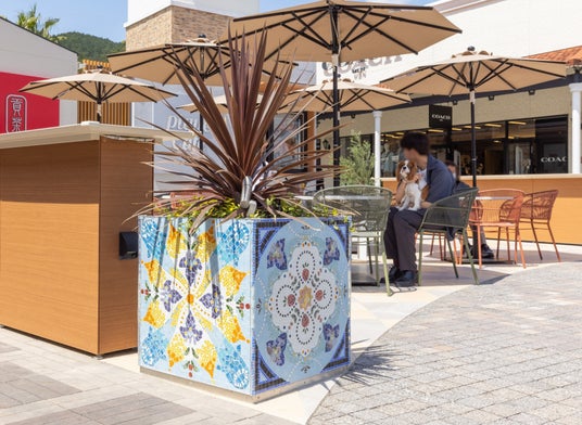タイルアートプランターの素材には、環境配慮型の素材等のサステナビリティを意識したリサイクル素材を活用しました。セラミックやタイルを使った装飾は、彩り豊かで表現の幅が広く、佐賀らしさや地域の魅力を表現しながら、スパニッシュ・コロニアルをイメージした鳥栖プレミアム・アウトレットのさわやかで明るい空間に調和させています。