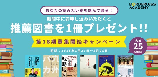 株式会社ボーダレス・ジャパン(本社:福岡県福岡市、代表取締役:田口一成)が運営する社会起業のためのソーシャルビジネススクール「ボーダレスアカデミー」は、第18期集中講座(2025年5月開講)の早期申込者を対象とした特別キャンペーンを開始しました。先着25名様に、ボーダレスアカデミーのメンターが厳選した書籍をプレゼントします。詳細は以下のキャンペーン概要をご確認ください。