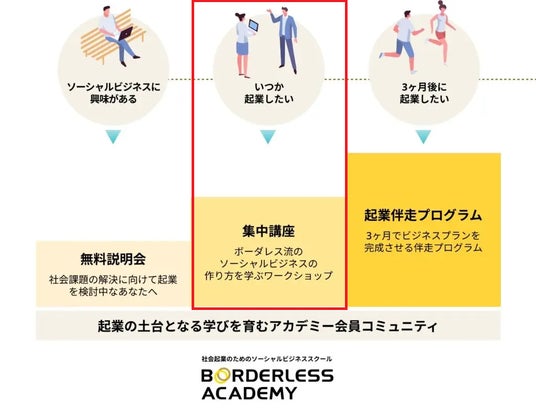 ボーダレスアカデミーは、世界13カ国で50のソーシャルビジネスを展開するボーダレス・ジャパンが運営する、社会起業のためのソーシャルビジネススクールです。
