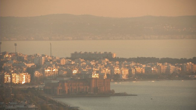 ちょうど夕暮れ時で赤く染まった空とテッサロニキの町並みが美しい風景をつくり出しています。