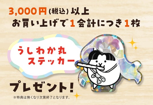 期間中ポップアップショップにて、にゃんこ大戦争・にゃんこ大商店のグッズを税込み3,000円以上ご購入された方に、先着で「伝説レア!うしわか丸のステッカー(非売品)」をプレゼントする店頭キャンペーンを実施します。この機会にぜひ、対象店舗にお立ち寄りくださいませ。
