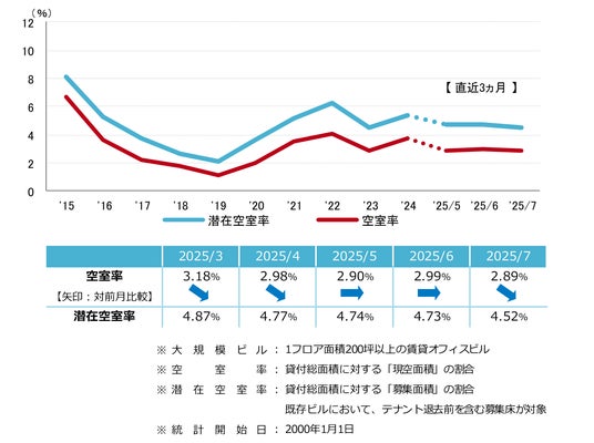 空室率は前月比マイナス0.10ポイントの2.89%となり、前月から小幅に低下した。昨年から今年にかけて竣工した新築・築浅ビルを中心に、オフィス環境の改善を目的とした移転等で空室消化が進んでいる。潜在空室率は前月比マイナス0.21ポイントの4.52%だった。