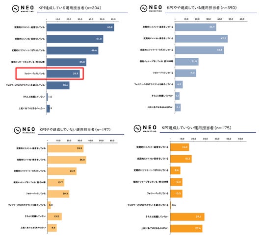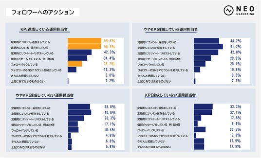 KPI達成度が高い担当者ほど、フォロワーへ「定期的にコメント・返信をしている」「定期的にいいね・保存をしている」と回答した割合が高くなっていることがわかります。