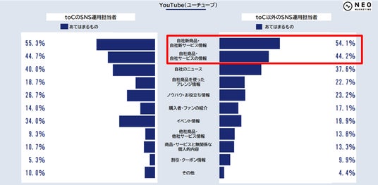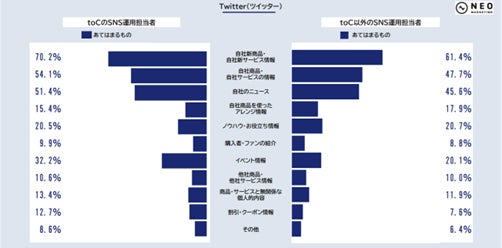 以下は、ビジネスモデルが「toC」と「toC以外」のSNS運用担当者の回答結果をそれぞれ比較したものです。