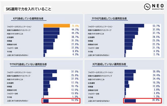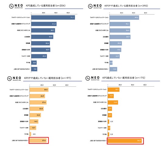 一方で、KPI未達成層は「いいね」すら得づらく、「きちんと把握していない」という回答も30%を超えており、フォロワーの反応を把握・分析する余裕がない、あるいは運用に対する自信が持てない状況がうかがえます。