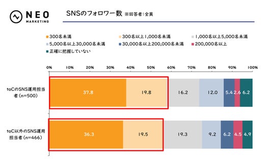 2021年調査では「toC」のSNSにおけるフォロワー1000名未満の割合は63.2%、「toC以外」のSNSにおけるフォロワー1000名未満の割合は59.0%だったところ、今回の調査では「toC」「toC以外」でそれぞれ57.6%・55.8%に。