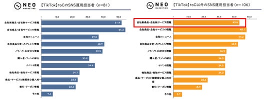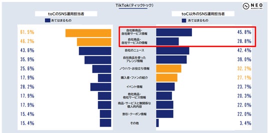 「TikTok」の場合、「toC」は「自社新商品・自社新サービス情報」「自社商品・自社サービスの情報」といった“売上につながる”宣伝色の強い投稿や「ノウハウ・お役立ち情報」がより多い一方で、「toC以外」は「自社のニュース」「購入者・ファンの紹介」「他社商品・他社サービス情報」といった“売上には直結しないが、認知や比較・検討の上で参考になる”投稿がより多い傾向がありました。