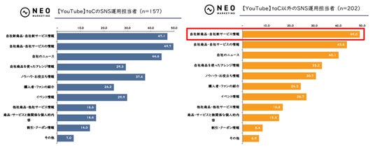 今回の調査において、特に「toC以外」で「YouTube」が「TikTok」を上回ったのは「自社新商品・自社新サービス情報」のみで、5.6ポイント差だったのに対し、2021年調査では「toC以外」の「自社新商品・自社新サービス情報」「自社商品・自社サービスの情報」の投稿利用率において、「TikTok」より「YouTube」の方がそれぞれ8.3ポイント・15.4ポイントも高くなっていました。
