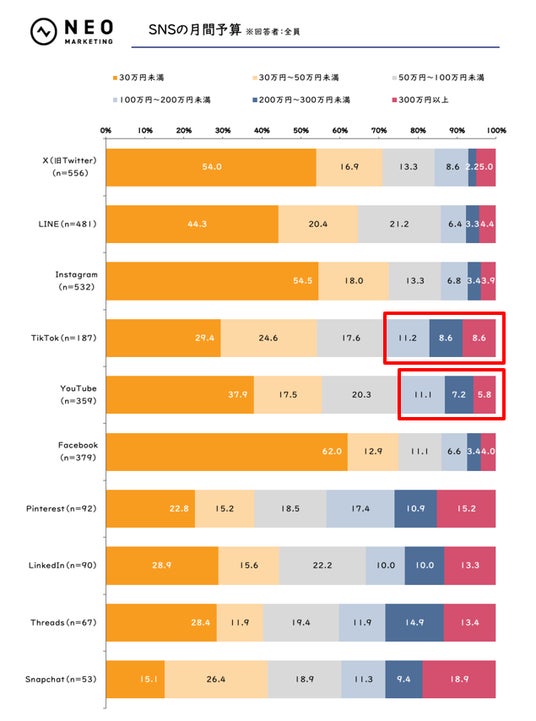 特に「TikTok」では100万円以上の予算をかける企業が28.4%に上り、300万円以上の比率も8.6%と、主要SNSの中では突出していた。一方、「X(旧Twitter)」や「Instagram」は「30万円未満」が50%を超えており、依然として少額運用が主流に。