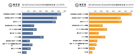「X(旧Twitter)」の場合、「toC」と「toC以外」のどちらもトップが「自社新商品・自社新サービス情報」で、そこに「自社商品・自社サービスの情報」または「自社のニュース」、かなり差をつけて「ノウハウ・お役立ち情報」「イベント情報」が続いており、投稿内容の傾向が近いことがわかりました。