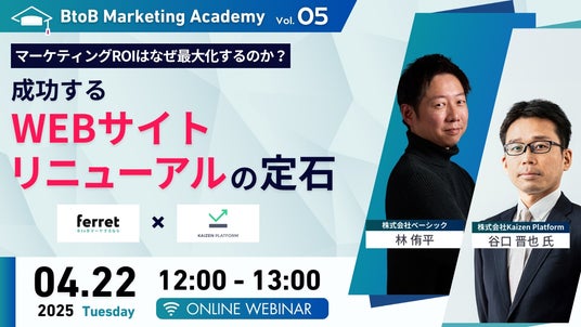 BtoBマーケティングのお困りごとをまるっと解決するサービス『ferret(フェレット)』を運営する株式会社ベーシック(本社:東京都千代田区、代表取締役:秋山勝)は、4/22(火)12時よりBtoB企業でのマーケティング責任者や担当者に向けたセミナー「マーケティングROIはなぜ最大化するのか?"成功するWEBサイトリニューアル"の定石」を開催いたします。