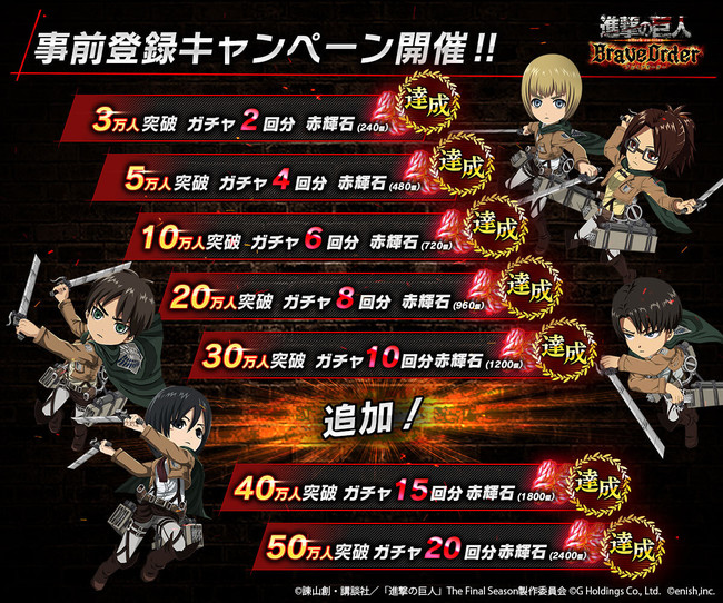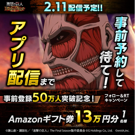 株式会社enish(本社:東京都港区、代表取締役社長:安徳 孝平、以下enish)は、2022年2月11日配信を予定しているアニメ『進撃の巨人』のスマートフォンゲーム最新作「進撃の巨人Brave Order」にて、アプリの事前登録者数が50万人を突破いたしましたのでお知らせいたします。こちらを記念いたしましてゲームアプリ公式Twitterアカウントにてキャンペーンを開催いたします。また、2022年2月11日の配信を目前に控え、毎日30名様以上に最大13万円分のAmazonギフト券が当たるカウントダウンキャンペーンを開催しております。最新情報は、ゲーム公式サイト・ゲーム公式Twitterアカウントにて随時公開して行きますので、ぜひご覧ください。