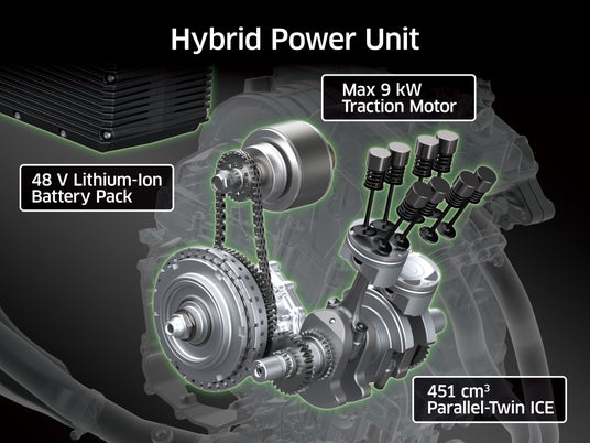 ・451cm³水冷4ストローク並列2気筒ガソリンエンジンと交流同期モーターのコンビネーションがもたらす、次世代のパワーフィーリング