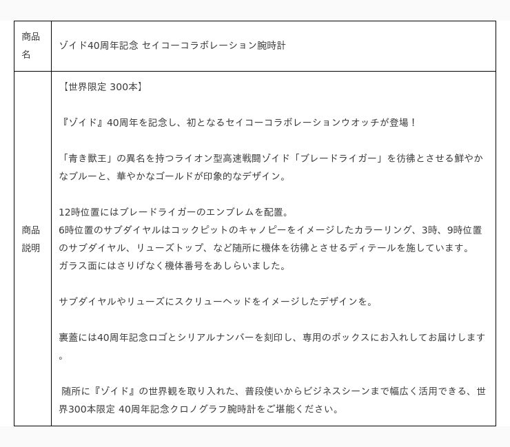 「青き獣王」の異名を持つライオン型高速戦闘ゾイド「ブレードライガー」を彷彿とさせる鮮やかなブルーと、華やかなゴールドを基調としたカラーで、随所に機体を彷彿とさせるディテールを施しました。300本の数量限定、裏蓋にはシリアルナンバーと40周年記念ロゴを刻印します。